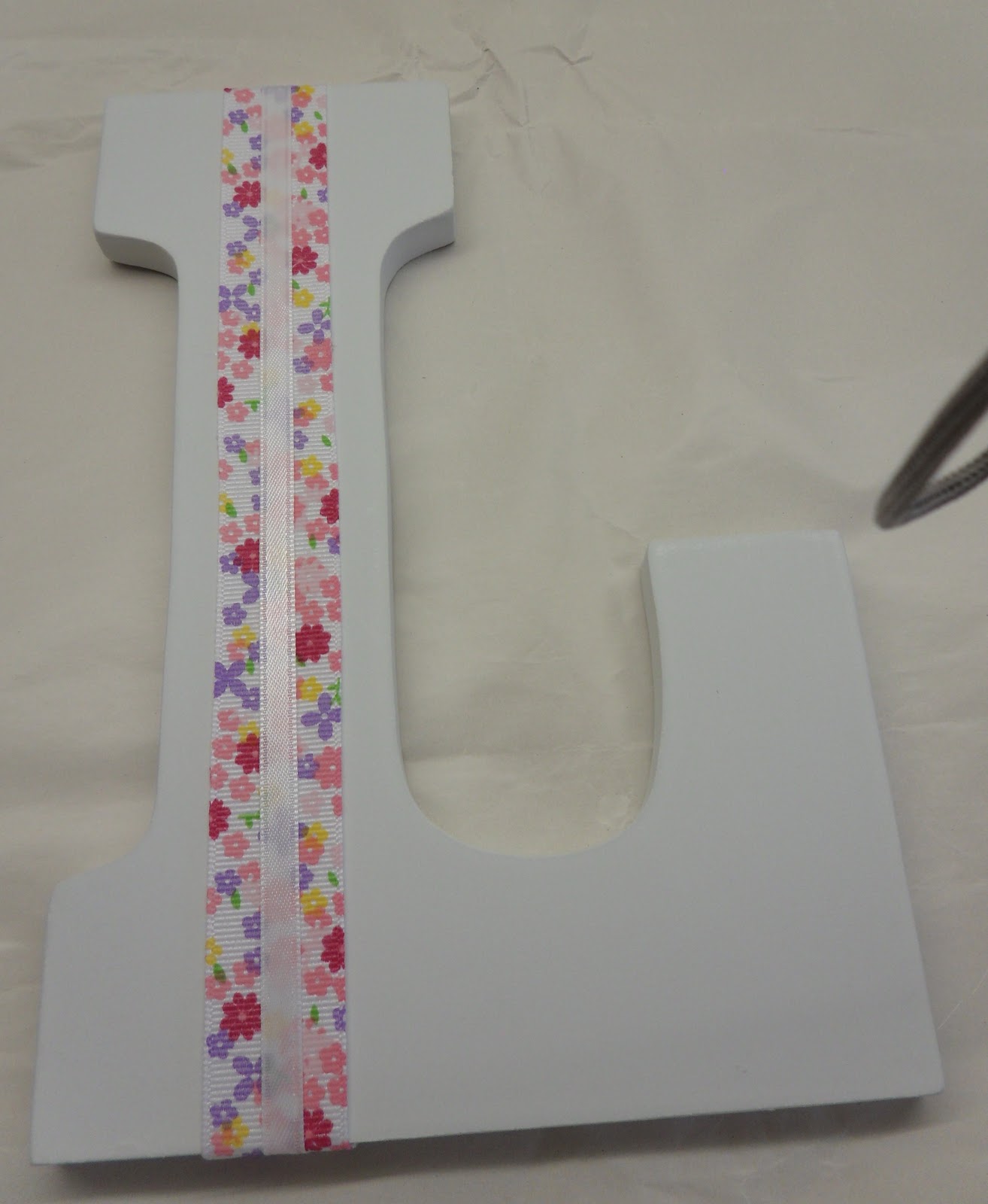 Here is a 10 minute craft. Get a large pre-painted white letter (or any color you fancy). This letter is about 9 inches tall. Wrap two ribbons (wide & narrow) around it and accent it with buttons, jewels, felt or paper flower, anything at all!! See mine?