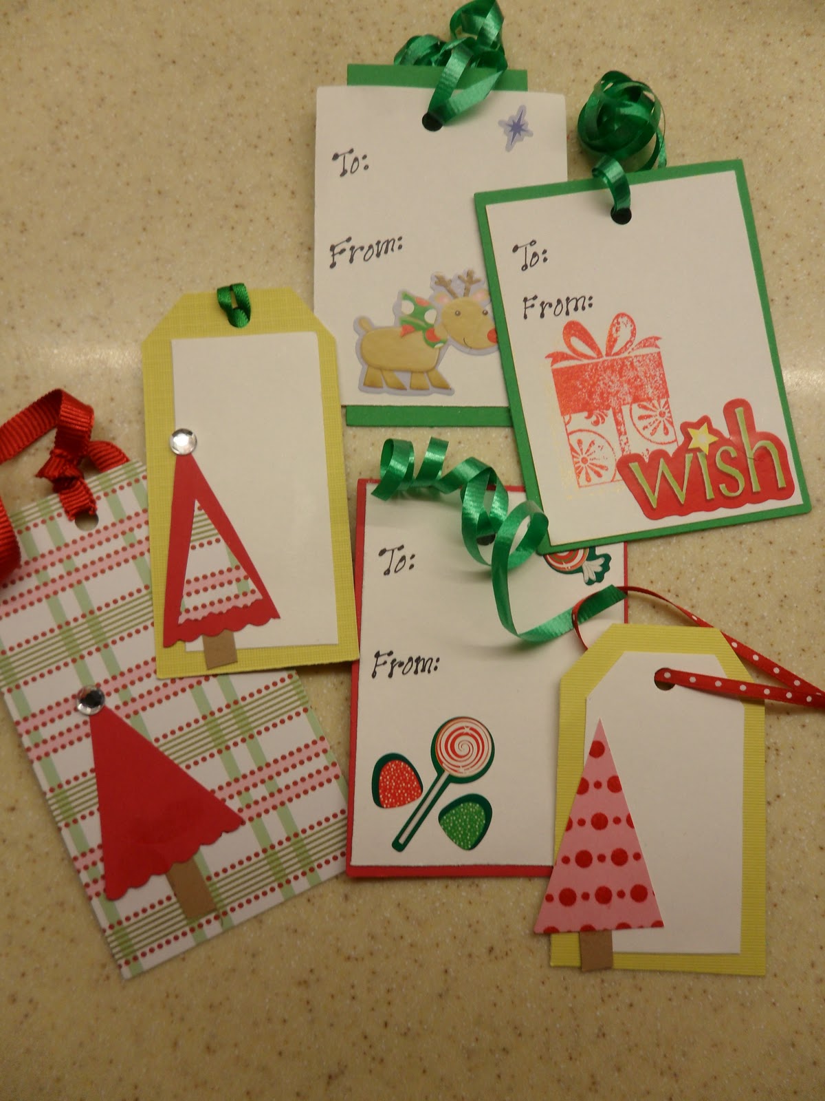 Home Made Tags: Card stock, stamps, ribbon, stickers, jewels: easy peasy!