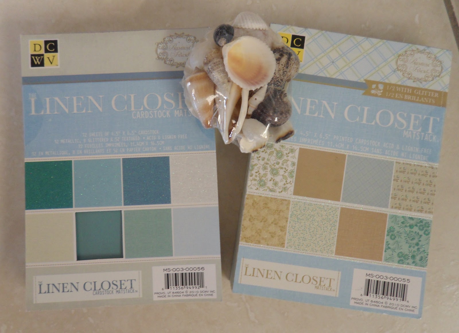 | Sea colored/patterned papers and real shells to mount pictures or something! (this Linen Closet collection has great greens, blues and taupes for the soft look.) |