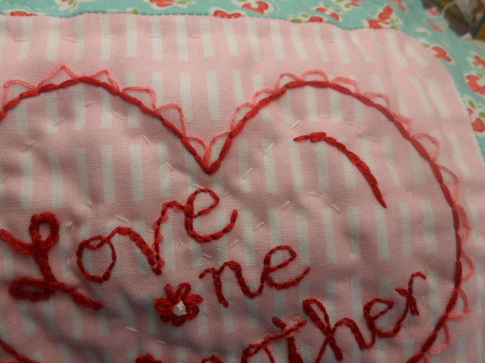 Here is the close up of the handquilting I did on The Love Note square. I just outlined the square and shadowed the heart on the inside a couple of times, and it has a soft puffiness to it. So pretty!