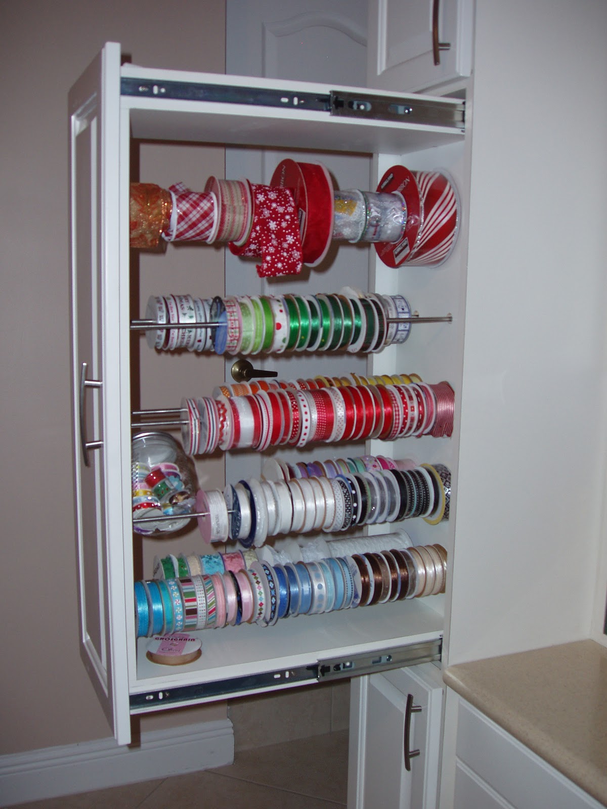 Then, I drew and sketched and inventoried my “hope” closet to make sure everything had a special place.  I had it down to specific dimensions since I was limited to a 10 ft. wall and no one sold what I wanted. We  found a cabinet maker who did it to my specifications (mostly) and with a few tweaks from my husband, it was perfect!  My favorite features (below) are the ribbon cabinet (which has 8 steel bars for small spools and 1 bar on top for large spools) and the overhead light feature with multiple outlet just under the glass cabinets.